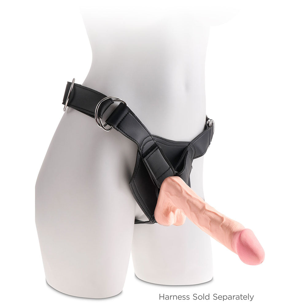 The King Cock Plus 10 inch Triple Density Cock with Balls is made of new and improved Fanta Flesh material, making it stiff on the inside and soft on the outside. The lifelike outer skin is smooth to the touch, while the inner shaft is stiff and erect like an actual penis, making your pleasure experience as true to real life as possible. The solid suction cup has been redesigned for more adherence, giving you more versatility and convenience during use. The suction cup also makes this King Cock Plus 10 inch Triple Density Cock with Balls harness compatible. Greater Realism Soft Skin with a Stiff Shaft Less Scent Improved Suction Cup Stability Wide Base is Trap-On Harness Compatible Total Length 10.03 in, 25.5 cm Widest insertable part 1.96 in, 5.0 cm Circumference, Widest insertable part 6.18 in, 15.7 cm Insertable Length 7.28 in, 18.5 cm